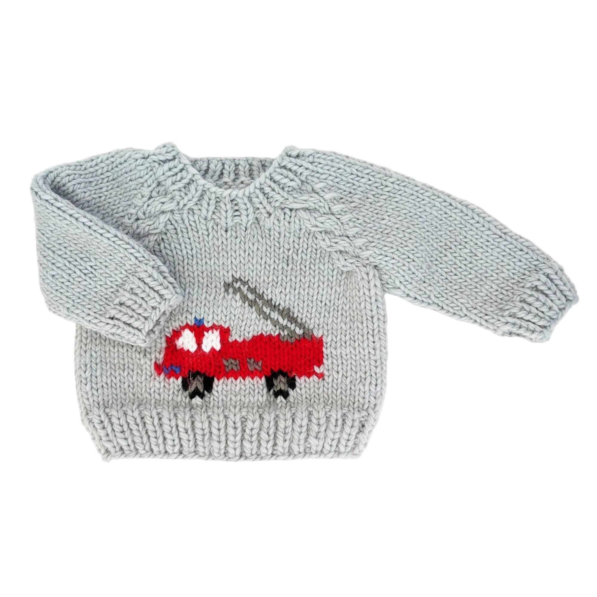 This Ice Grey pullover sweater features a Red fire engine knit on the front, with a softly knit neck for easy wear. Hand-knit with cozy yarn and cable trim raglan sleeves, this sweater is soft and warm, perfect for any little person.