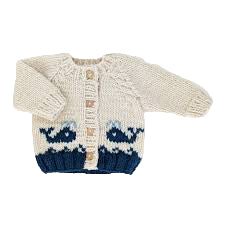 Here's a delightful hand knitted cardigan, adorned with charming blue whales with spouts of water swimming in water on a Natural hued background. This playful cardigan is designed with attention to detail, featuring natural wood buttons for closure and cable trimmed raglan sleeves Don't don't miss out on our matching whale beanie hat to complete the look.