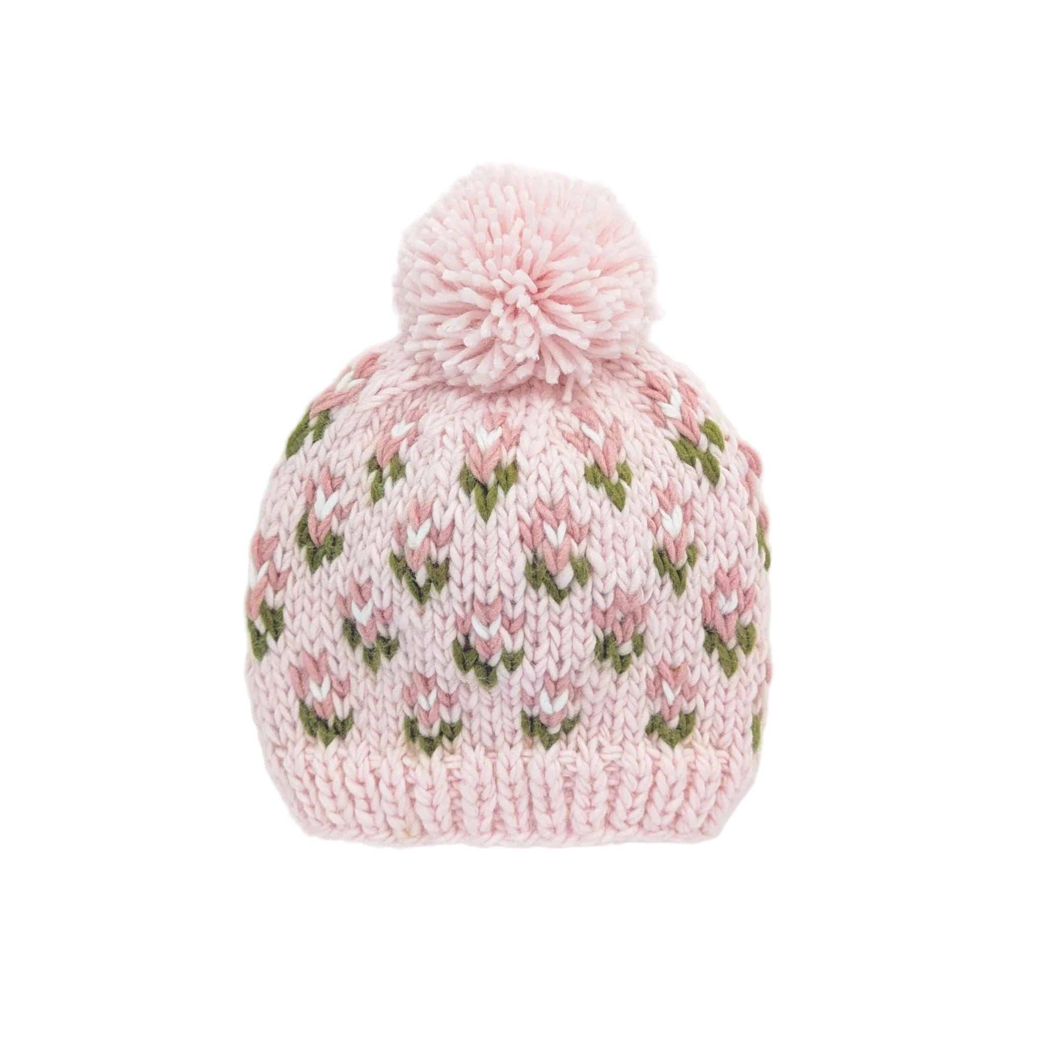 Elevate baby's wardrobe with our Bitty Blooms Blush Pink Beanie Hat. Boasting a design adorned with delicate rosy pink flowers and mossy green leaves, this hat is complete with a fluffy matching pom pom. For a charming coordinated look, pair it with our matching cardigan sweater.