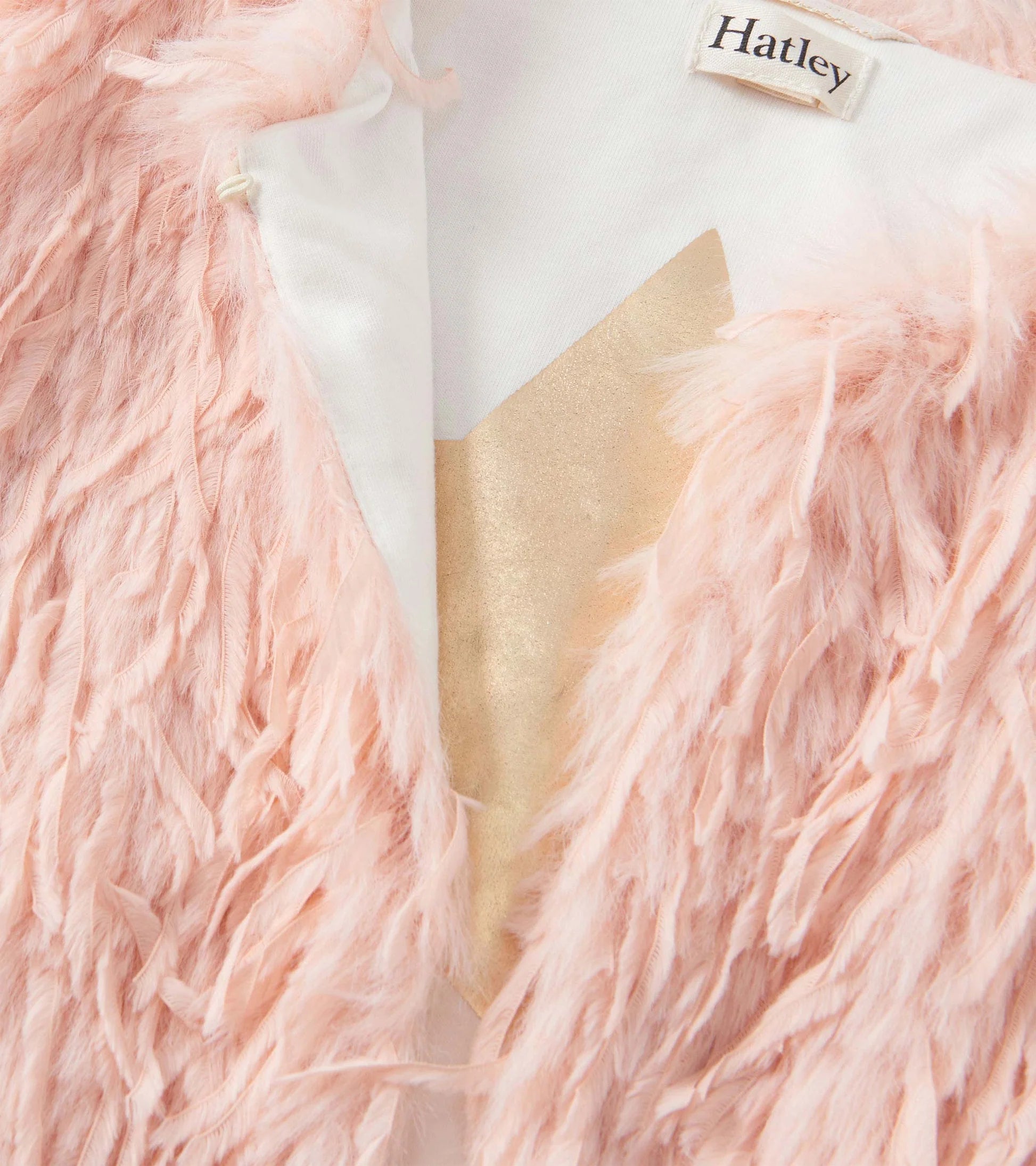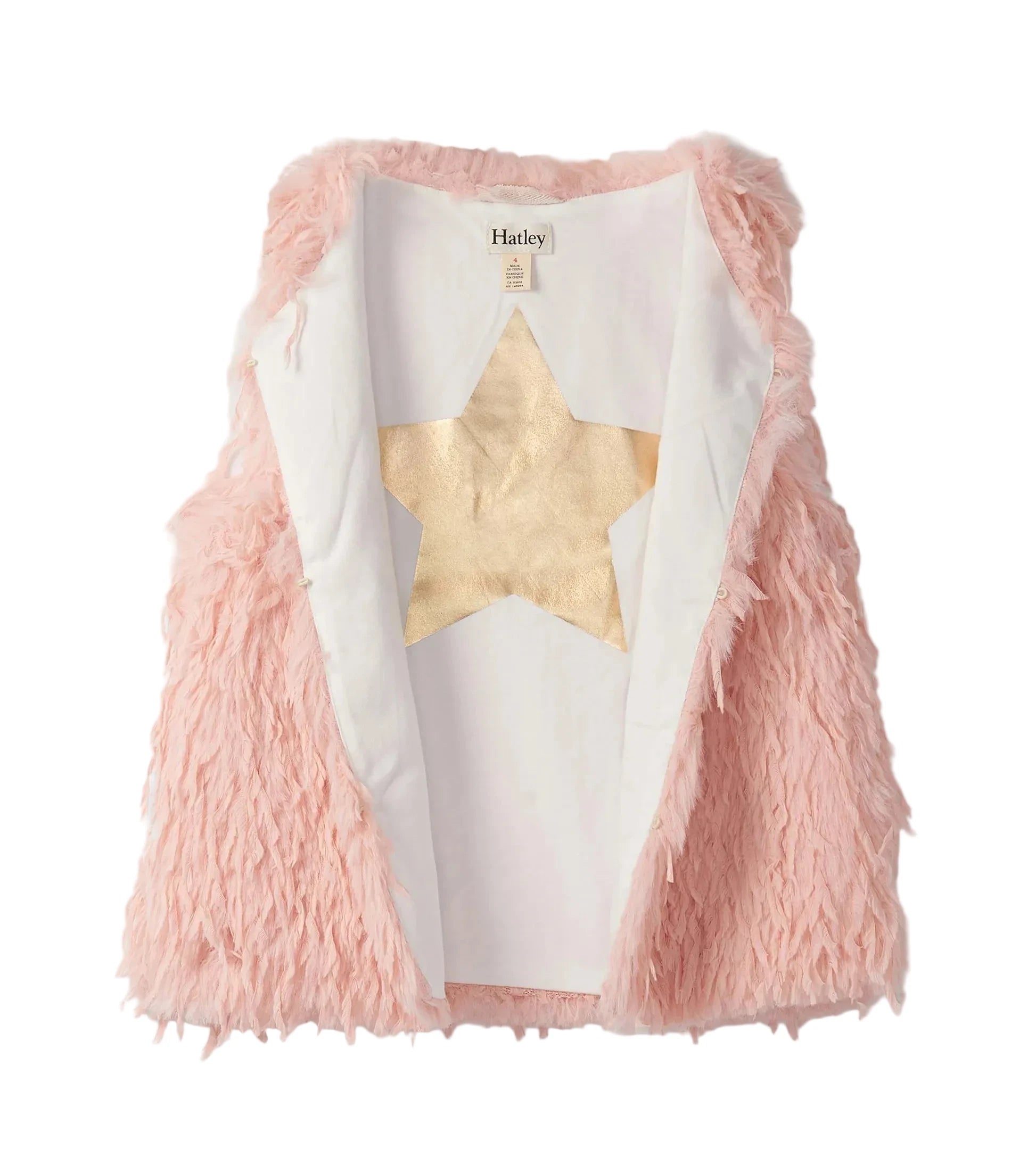 Fluffy and fabulous, the Girls Pale Pink Feather Faux Fur Vest in Pink adds cozy charm to any outfit. With a fully lined white interior, side slit pockets, and an A-line shape, it closes with three hook-and-eye fasteners and features a soft feather-like texture in light pink. A shiny gold holographic star printed inside the back adds a magical hidden touch!