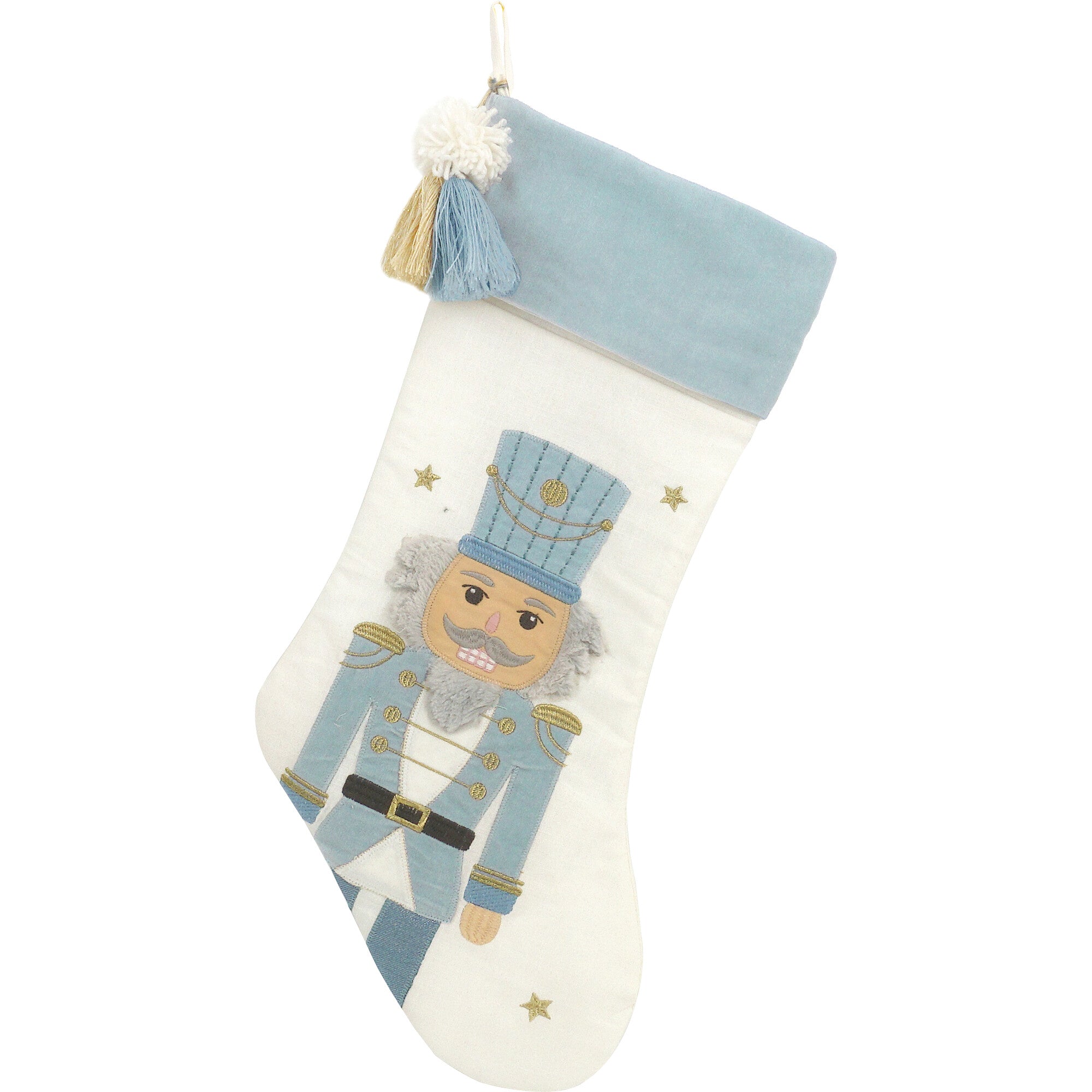 You're never getting coal with a stocking this fa-la-la-la fabulous! Mon Ami's Nutcracker Stocking in winter blue boasts a luxurious tri-colored tassel and plush velvet trim. Featuring a dapper Nutcracker and twinkling gold stars, our 21-inch Christmas stocking is ready to be packed with presents. A wide monogrammable hem lets you personalize this Nutcracker stocking while a durable loop makes it easy to hang anywhere in the living room. Gift our deluxe Christmas stocking to someone special in your life or keep it for yourself.