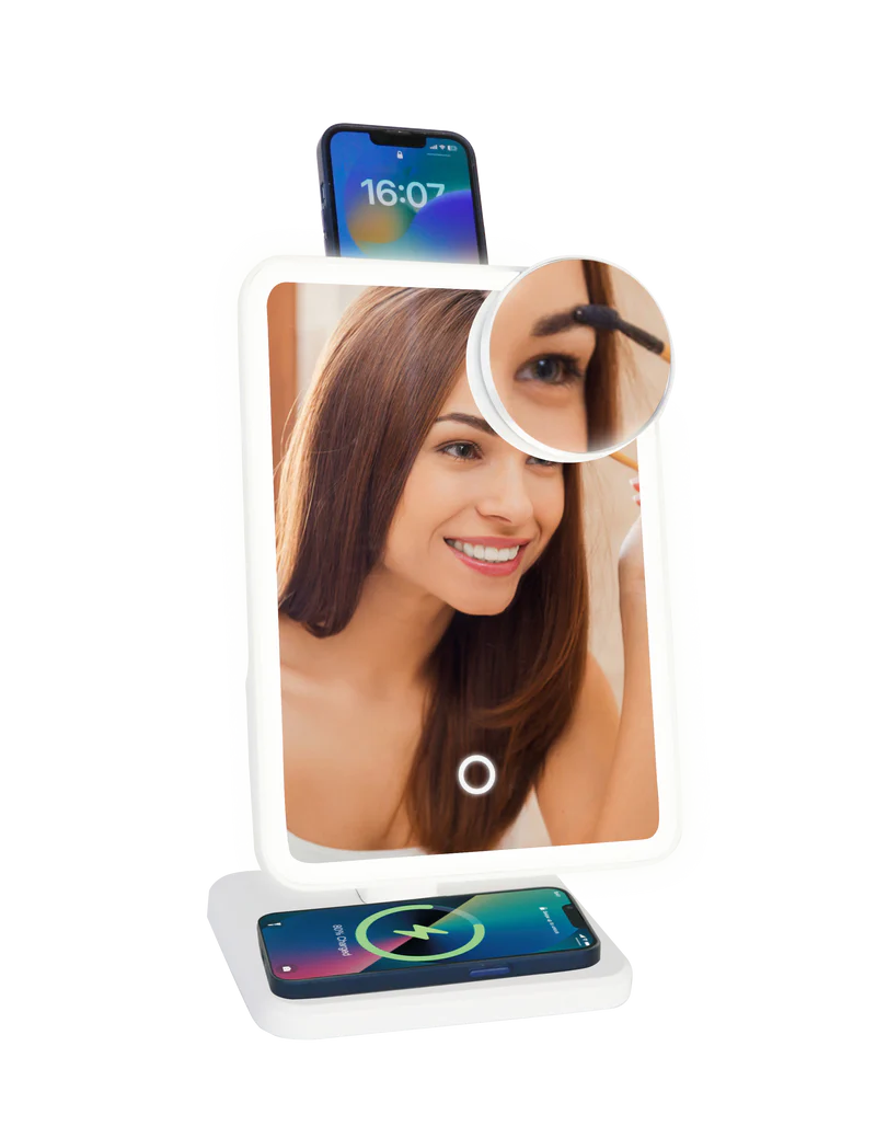 Glam Studio is an elegantly designed adjustable mirror that allows you to find your perfect angle effortlessly. With surrounding LED lights, a removable magnifier, and dedicated phone holder you can stay camera ready while always having the best view.