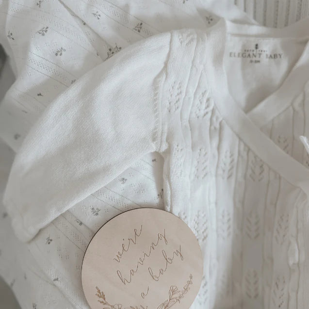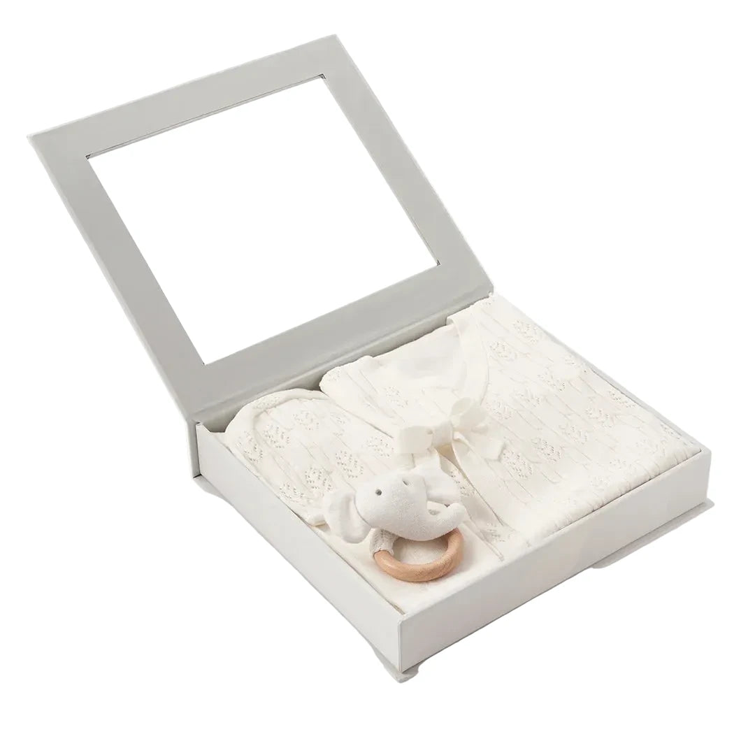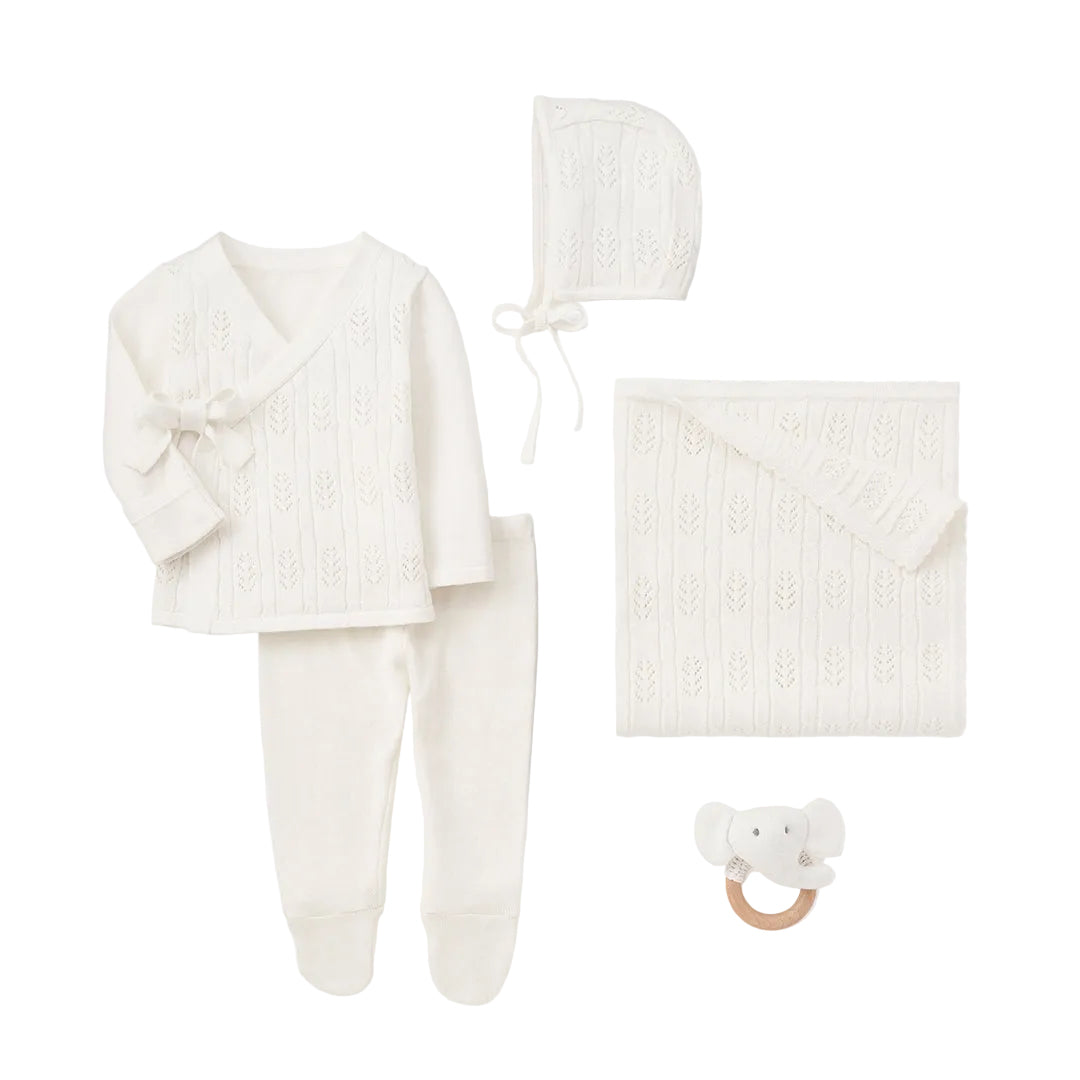 Our sweet Baby Layette Set is the perfect gift, making homecoming extra special. This luxurious set comes in three colors and includes a soft kimono wrap top with fold-over no-scratch mittens, blanket, bonnet with delicate Pointelle detailing, cozy footed pants, and elephant wood ring rattle. Packaged in a keepsake box, you can give a gift to parents and baby that is elegantly displayed. This timeless set is great for first photos and can be passed down to future generations. Pair it with one of our Baby Plush Toys or hooded bath wraps for added love.