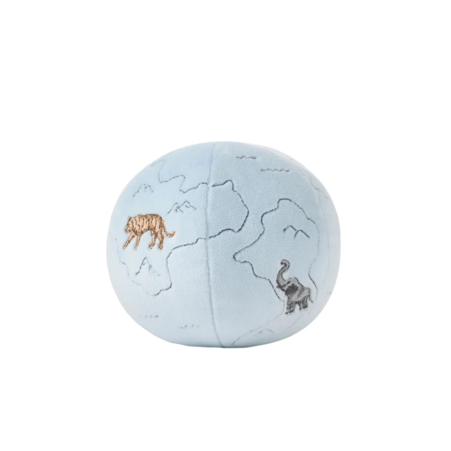 A tiny world of wonder in the palm of their hands—this soft light blue globe rattle features delicate embroidery of wild animals from across the continents. Crafted for little explorers, it's the perfect first toy to inspire a love of adventure.