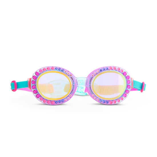 Sparkle and splash this summer in Bedazzled Blue Swim Goggles, designed for kids ages 6 and up! Featuring a brand-new round-shaped glitter frame, this dazzling design is an updated version of our famous rhinestone swim goggles, offering even more glamour and shine. Adorned with a full set of classic rhinestones and finished with an easy-on back clip, these goggles ensure a secure, no-tug fit for effortless swimming in style!